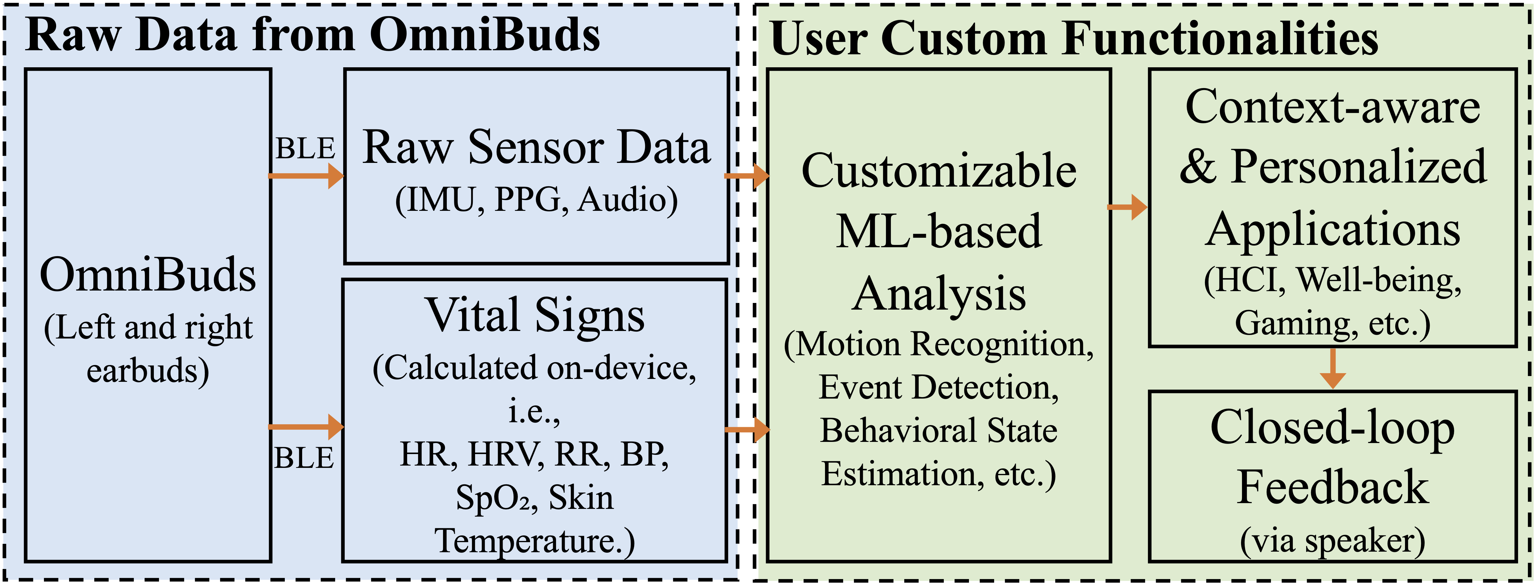 As shown in the right figure below, the system architecture integrates multimodal sensing, machine learning based analysis, and personalized feedback loops. The AI layer fuses physiological and motion data from OmniBuds to enable adaptive, context-aware applications such as gaming and human–computer interaction.