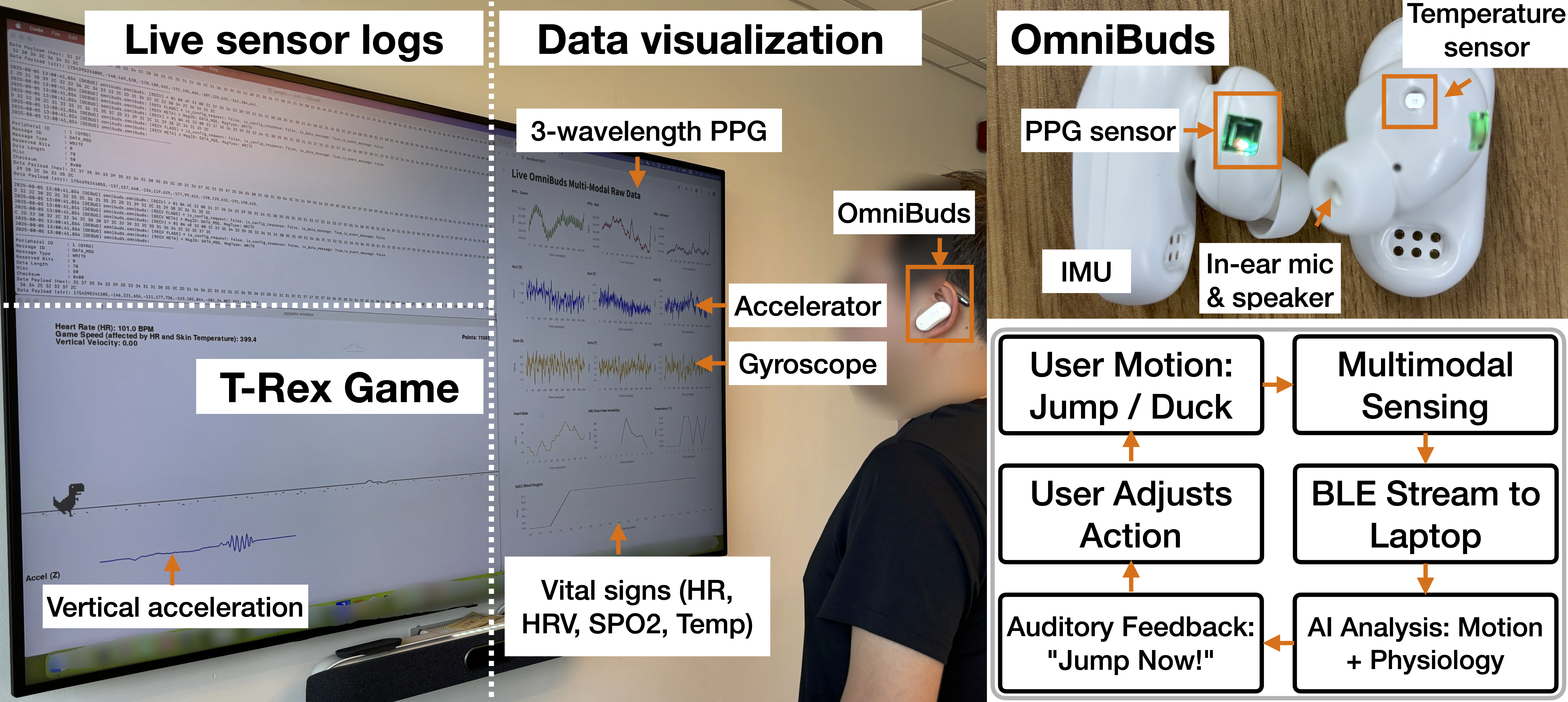 In this demo, OmniBuds act as an AI-enhanced human–machine interface to control the Chrome T-Rex game. Head and body motions detected through IMU data trigger jumping and ducking actions. A real-time visualization dashboard displays raw IMU and PPG waveforms, derived vital signs, and gameplay feedback. The AI assistant analyses user performance, which includes reaction time, movement quality, fatigue indicators, and heart rate and provides adaptive auditory cues such as “Jump/Duck now!” through the earbuds.