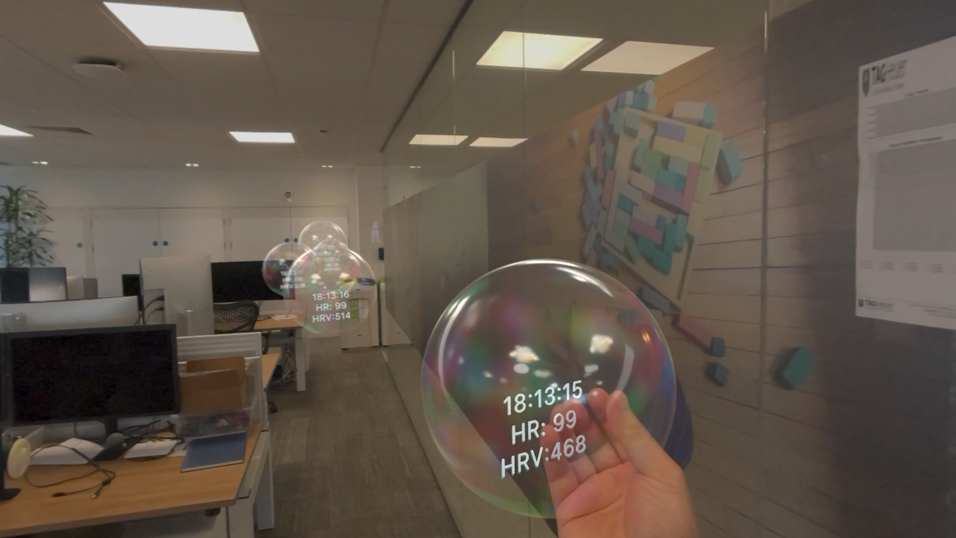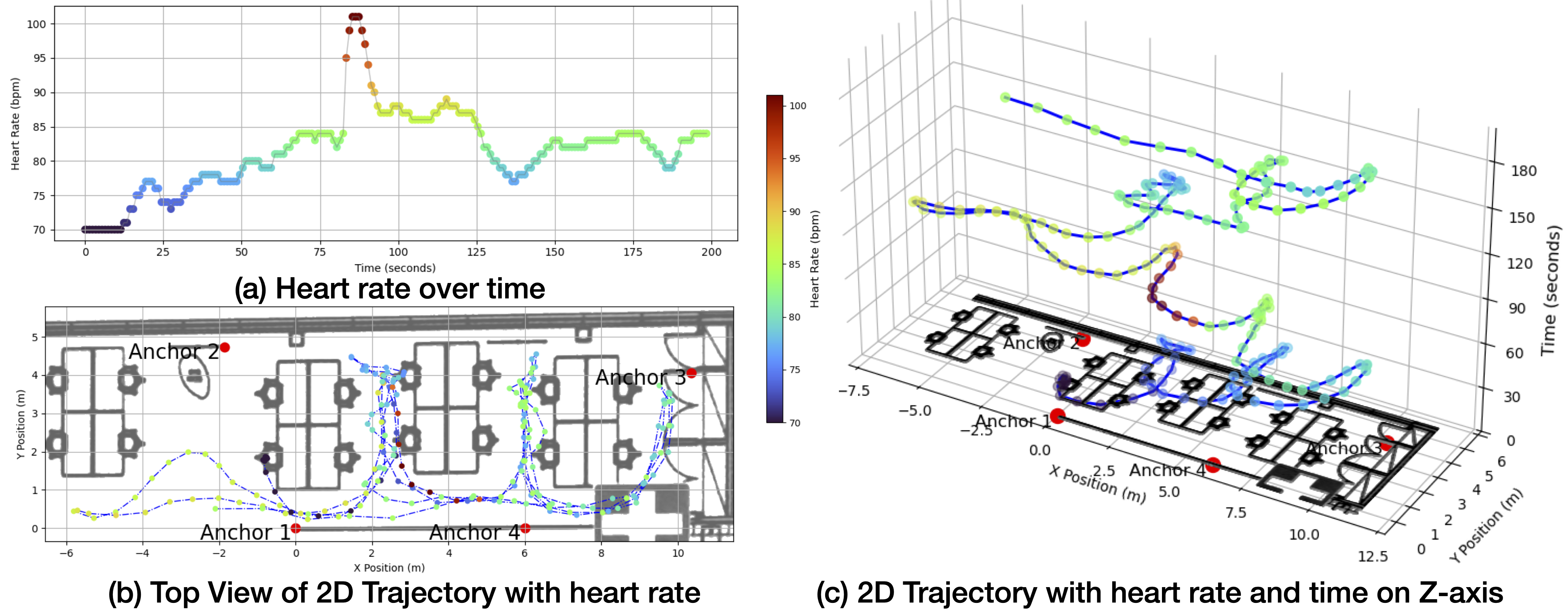 It bridges the gap between body and environment to capture heart rate, HRV, respiration, and temperature from OmniBuds, while integrating Ultra-Wideband (UWB) indoor localization and environmental data such as light, sound, and temperature. The result is an immersive spatiotemporal health map rendered in 2D, 3D, and Apple Vision Pro environments, enabling intuitive visualization of how the body responds to its surroundings in real time.