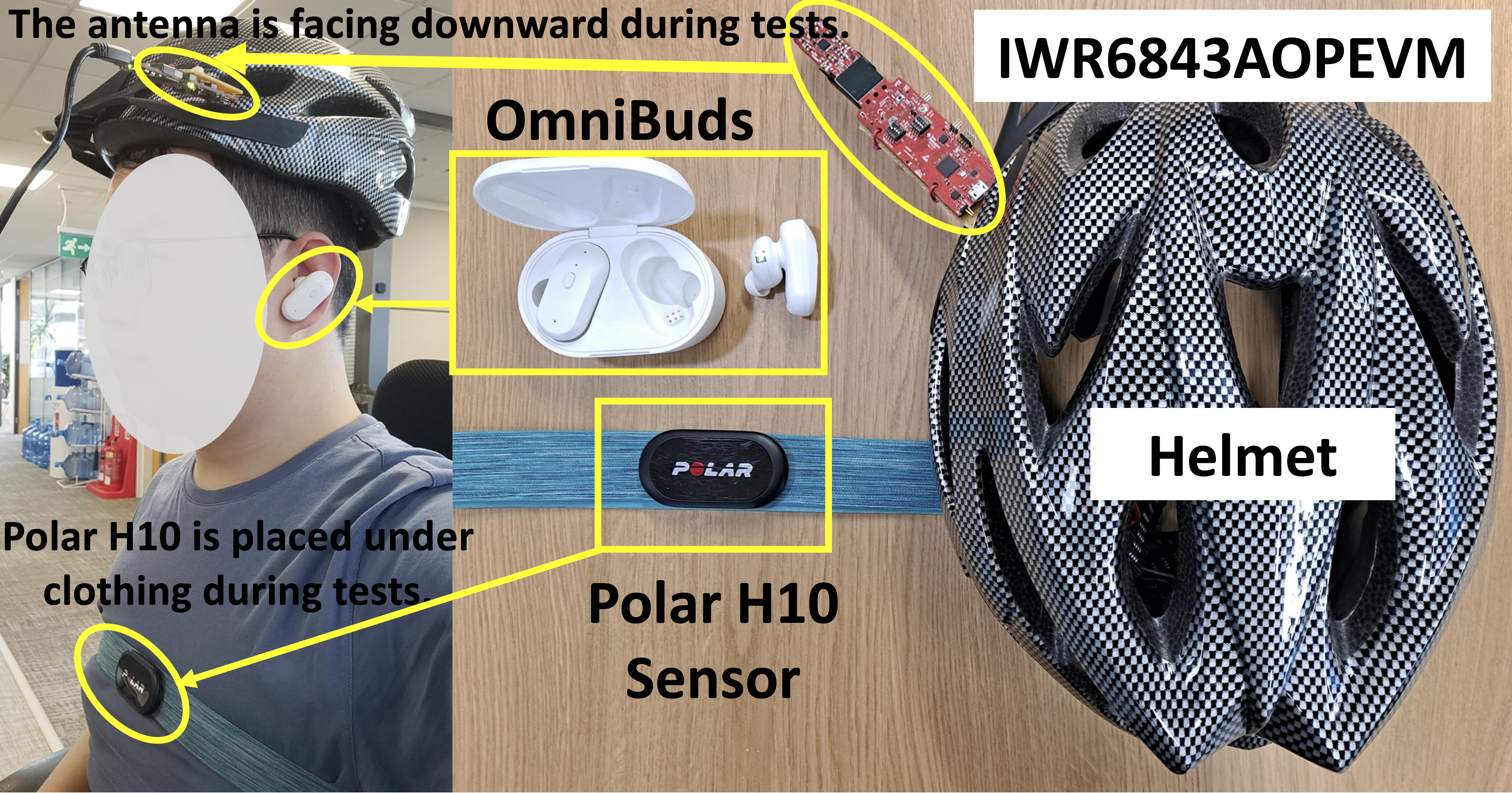 In this work, I designed and built the first head-mounted mmWave sensing prototype for vital sign monitoring, integrating a TI IWR6843AOP radar into a helmet alongside OmniBuds and Polar H10 sensors for benchmarking.