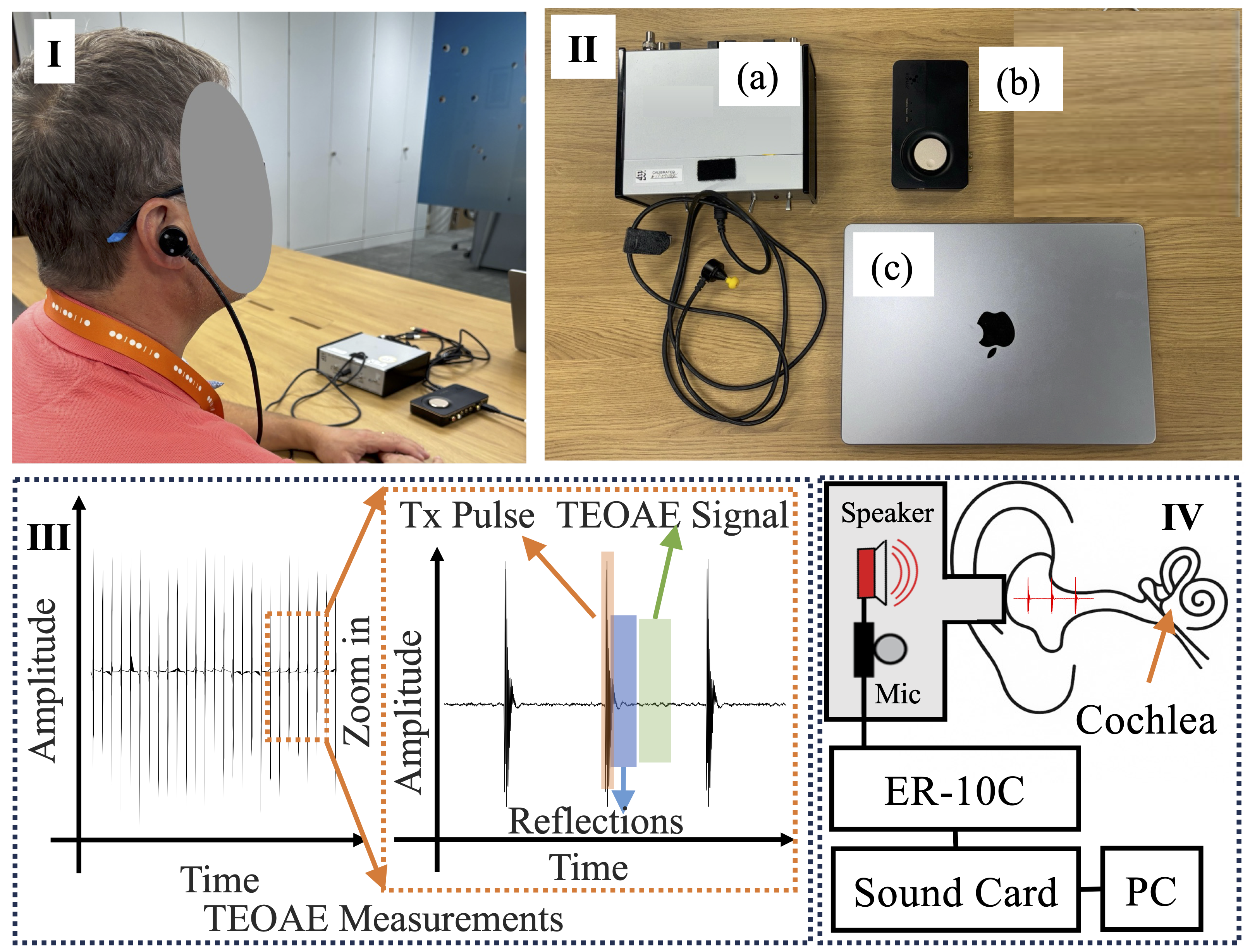 (I) Participant with ER-10C probe, (II) Hardware chain, (III) Time-domain TEOAE waveform, (IV) Measurement schematic.